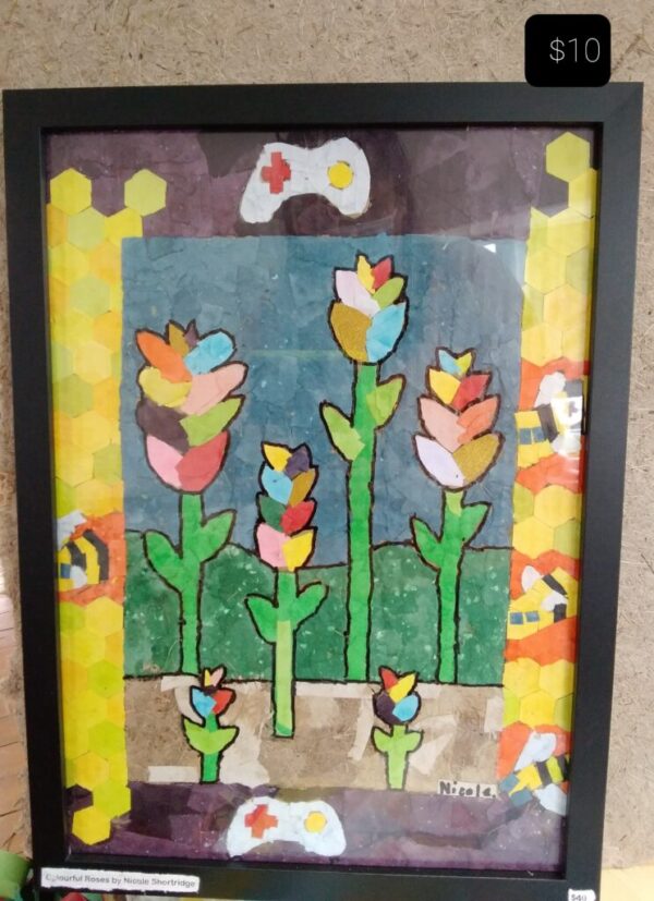 Flowers and bees. A picture made with handmade paper and ink. Nicole has also included gaming consoles in her picture. She loves gaming 🙂